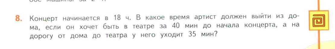 Концерт начинается в 18 ч. В какое время артист должен выйти из дома, если он хочет быть в театре за 40 мин до начала концерта, а на дорогу от дома до театра у него уходит 35 мин?