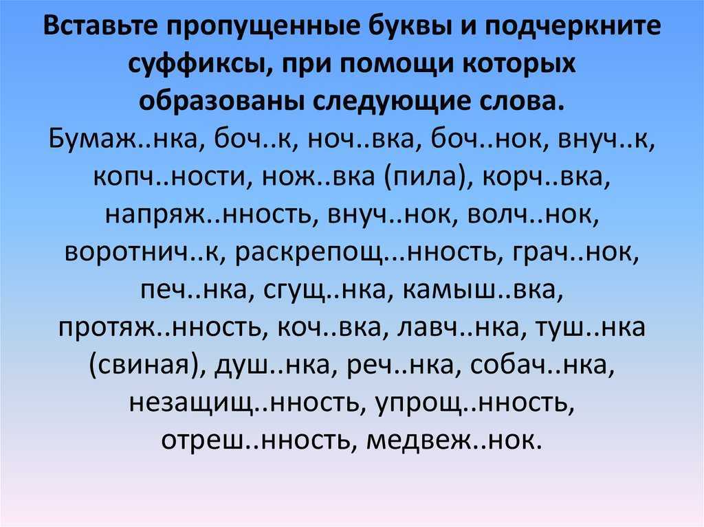 4. Используя суффиксы, заставь слова звучать ласково . Выдели суффиксы.