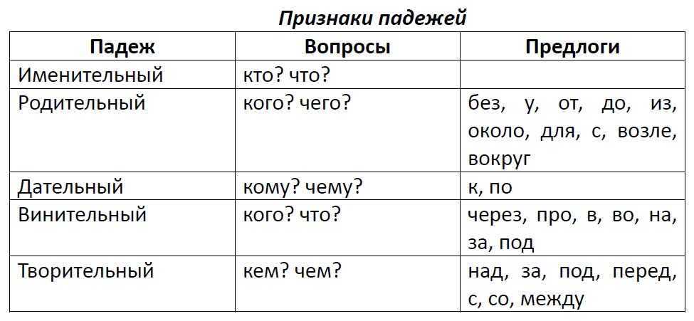 Еще существительное может изменятся по падежам. Всего их в русском языке шесть. Каждый отличается падежным вопросом и предлогом.