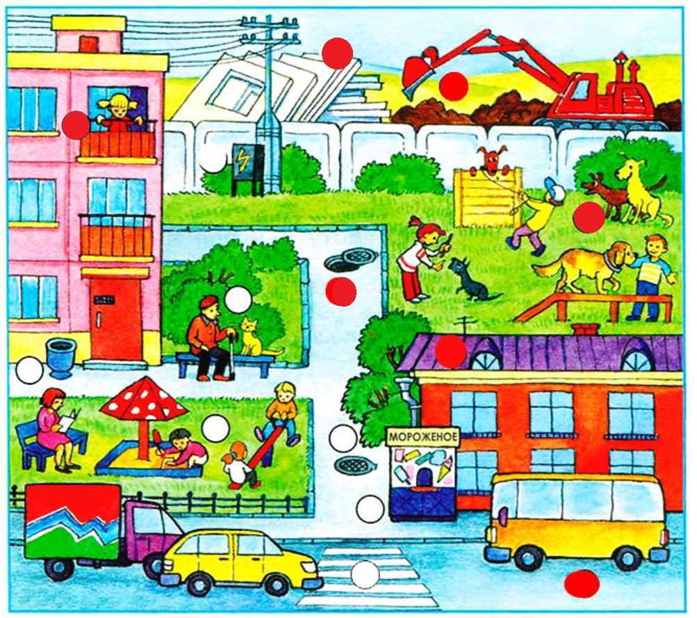 2. Рассмотри рисунок. Отметь (закрась кружки красным цветом) те места, которые ты считаешь опасными.Посмотри, что отметили другие ребята. Обсудите ваши решения.
