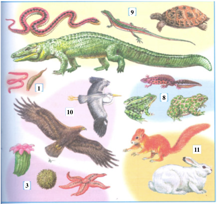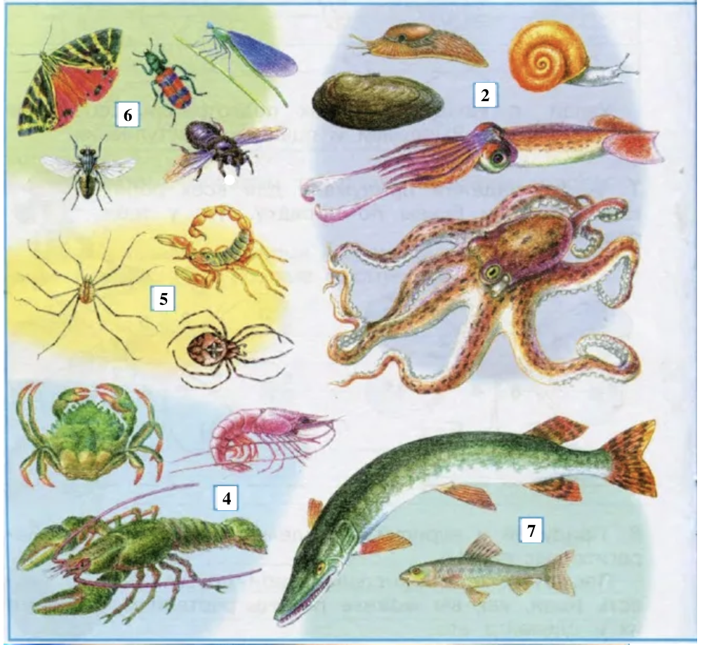 1. Черви. 2. Моллюски. 3. Иглокожие. 4. Ракообразные. 5. Паукообразные. 6. Насекомые. 7. Рыбы. 8. Земноводные. 9. Пресмыкающиеся. 10. Птицы. 11. Звери.