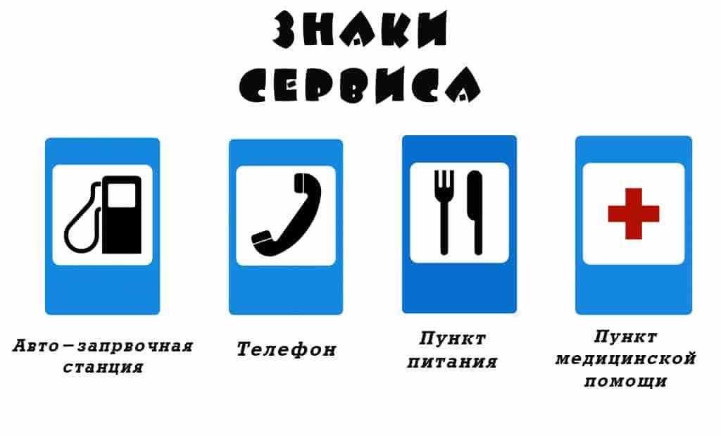 Сервис − это обслуживание. Знаки сервиса − это подсказка для водителя, где находится аптека, пункт питания и т.д.