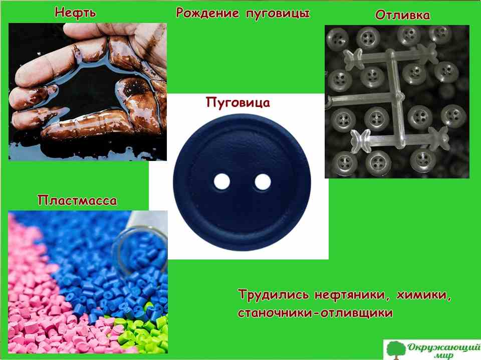 Для получения пуговицы использовалась нефть и продукты её перегонки. Трудились нефтяники, химик, операторы станков.